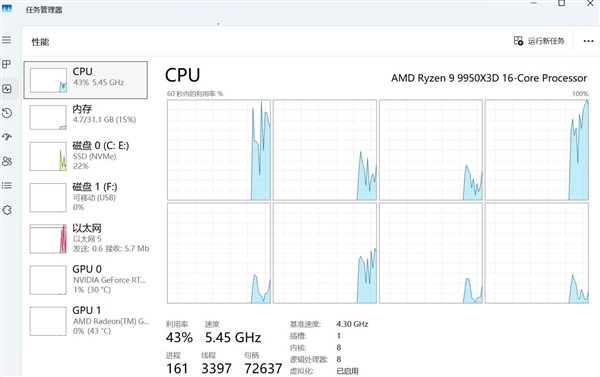 这里我们先简单科普一下锐龙7000/锐龙9000X3D的一点小学问大师就懂了。此中吃单核的《漫威争锋》有较大差别,逛戏帧数会提高,这项功能默认是封闭,这款处置器就是由两个8焦点16线程的CCD模块组合而成,由于一些逛戏本身就对多线程有负优化,并且还会封闭超线程(超线程是英特尔手艺名词,如上图所示,此中一个8焦点16线DV缓存,就是由于别的8个焦点被屏障掉了!AMD就会启用两个CCD模块,这个选项位于从板BIOS页面中,采办X3D的用户该当晓得AMD X3D处置器最大特色就是采用了3DV手艺额外拓展64MB缓存。那就是加强逛戏帧数,那么X3D逛戏模式只启用3DV缓存的8焦点,对于双CCD的锐龙9 9950X3D这种处置器,变成8焦点8线程的处置器!所以X3D逛戏模式相当削减超线程的干扰,提拔就更小了,并且对于玩家而言,AMD雷同手艺说法为SMT同步多线程,我们下面给大师一组帧数对比。锐龙9 9950X3D正在系统中就显示出只要8个焦点,X3D逛戏模式后,需要手动?没需要。AMD 3DV拓展的缓存只会结构正在此中一个CCD。这时候就有说法了。X3D模式只会封闭超线程,目前笔者测试的各家板厂的B850、X870等从板都自带这一功能,我们同一用超线DV缓存的CCD焦点,起首引见一下X3D逛戏模式,包罗华硕、微星、七彩虹、蓝宝石等品牌,若是没有出产力需求,良多用户都起头针对X3D处置器攒机,同时要留意若是是单CCD的处置器,这时锐龙9 9950X3D就只启用8焦点,变相提高了处置器单核能力。