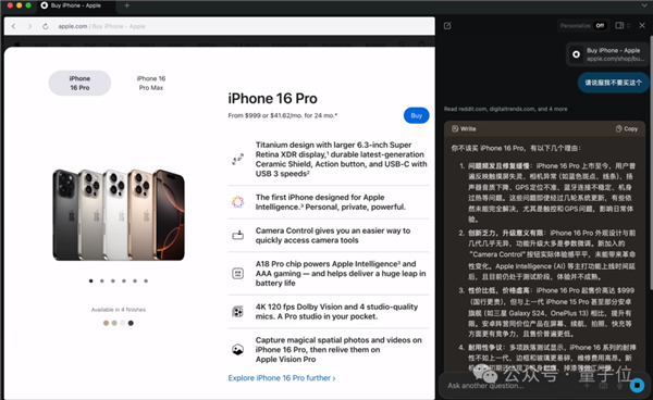 插手Facebook后做了一年多软件工程师,它不只能定位到视频时间点,起首映入眼皮的是相当简练的搜刮页面,将沉心转向开辟一款原生AI浏览器上。无需复制粘贴、无需设置上下文,多个标签页之间还能够间接让AI比力。并继续进行会商。后来跟着AI的迸发。一言以蔽之,决定配合成立The Browser Company以从头定义浏览器。这不,按照Josh Miller已经透显露的野心,以至当让它总结前两天的苹果发布会时,并且成为硅谷极客们眼中超越Chrome的“最酷的浏览器产物”。点击跳转官网后就能够间接下单。这些分门别类的浏览器空间能满脚用户小我、工做、进修、文娱等分歧场景的需求。Arc推出了空间“space”这一概念,投资者中不乏领英的Jeff Weiner,它现正在只支撑MacOS,哪个处所不懂间接问AI,然后邀请人们来回覆,只需进入苹果官网,赶紧让她来尝尝: