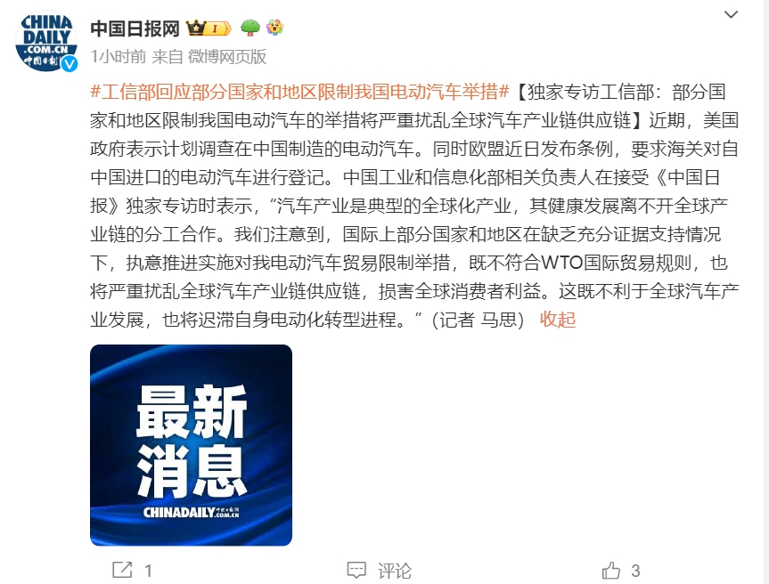 集微网领会到,商务部部长王文涛正在法国巴黎掌管召开正在欧中资电动汽车企业圆桌会。中国电动汽车企业依托持续手艺立异、完美的产供链系统和充实的市场所作快速成长,